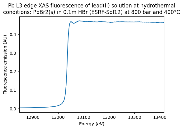 Pb L3 edge XAS fluorescence of lead(II) solution at hydrothermal conditions: PbBr2(s) in 0.1m HBr (ESRF-Sol12) at 800 bar and 30°C