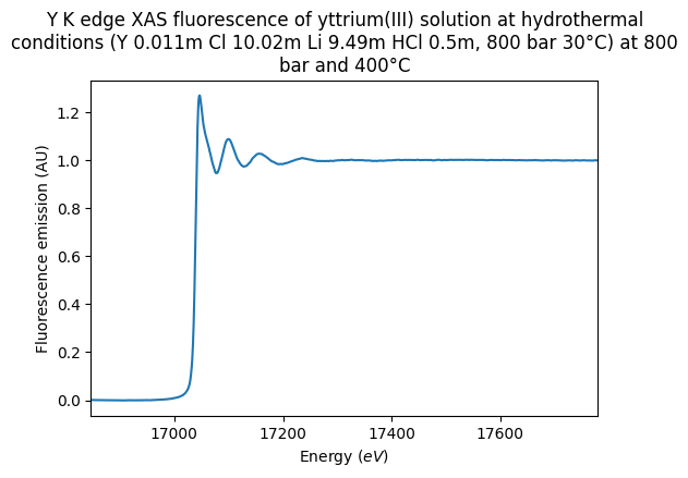 Y K edge XAS fluorescence of yttrium(III) solution at hydrothermal conditions (Y 0.011m Cl 10.02m Li 9.49m HCl 0.5m, 800 bar 30°C) at 800 bar and 400°C