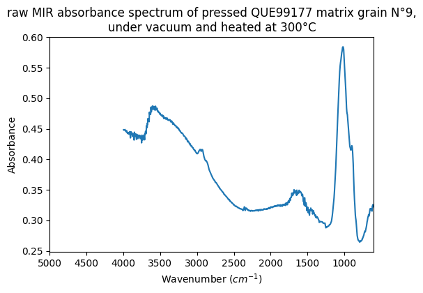 raw MIR absorbance spectrum of pressed QUE99177 matrix grain N°9, under vacuum and heated at 300°C