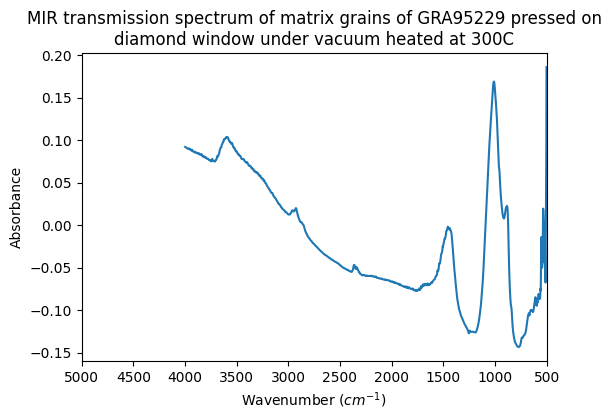 - Bonal, Lydie (2011): Raw, normalized and baseline-corrected of MIR transmission spectra of GRA95229 matrix grains pressed on diamonds under vacuum at ambiant temperature and 300C. SSHADE/GhoSST (OSUG Data Center). Dataset/Spectral Data. https://doi.org/10.26302/SSHADE/EXPERIMENT_LB_20170731_003