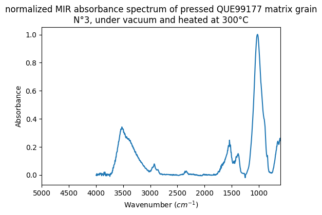 normalized MIR absorbance spectrum of pressed QUE99177 matrix grain N°3, under vacuum and heated at 300°C
