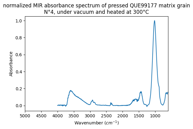 normalized MIR absorbance spectrum of pressed QUE99177 matrix grain N°4, under vacuum and heated at 300°C