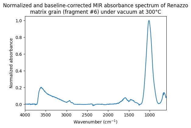 Normalized and baseline-corrected MIR absorbance spectrum of Renazzo matrix grain (fragment #6) under vacuum at 300°C