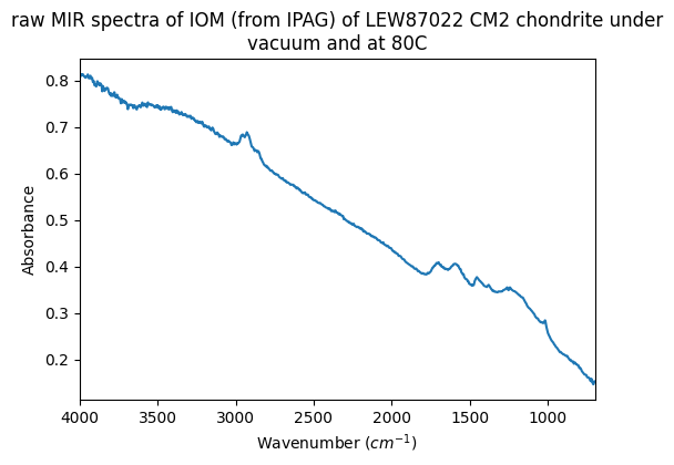 - Quirico, Eric; Flandinet, Laurene (2016): MIR spectra of IOM from CM and C2-ungrouped chondrites under vacuum and at T=80C. SSHADE/GhoSST (OSUG Data Center). Dataset/Spectral Data. https://doi.org/10.26302/SSHADE/EXPERIMENT_LB_20180718_001
