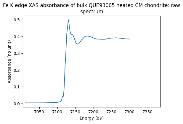 Fe K edge XAS absorbance of bulk QUE93005 heated CM chondrite: raw spectrum