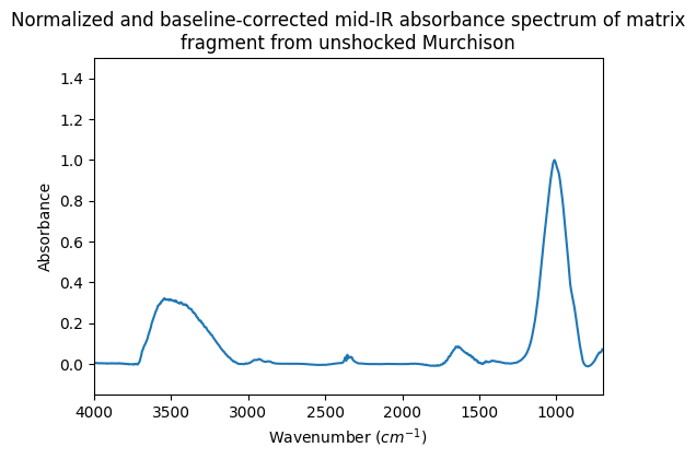 - Quirico, Eric (2010): Mid-IR absorbance spectra, normalized and baseline-corrected, of matrix and IOM fragments extracted from unshocked and shocked Murchison (CM2 chondrite) acquired under vacuum and at T = 80°C. SSHADE/GhoSST (OSUG Data Center). Dataset/Spectral Data. https://doi.org/10.26302/SSHADE/EXPERIMENT_LB_20240821_001