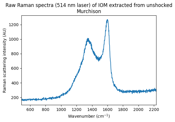 - Quirico, Eric; Bonal, Lydie (2010): Raman spectra (514 nm, raw and baseline-corrected) of matrix fragments and IOM extracted from unshocked and shocked Murchison (CM2 chondrite) and from shocked EET90628 (L3 chondrite). SSHADE/GhoSST (OSUG Data Center). Dataset/Spectral Data. https://doi.org/10.26302/SSHADE/EXPERIMENT_LB_20240904_001