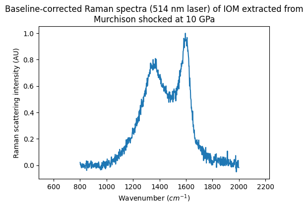 Baseline-corrected Raman spectra (514 nm laser) of IOM extracted from Murchison shocked at 10 GPa