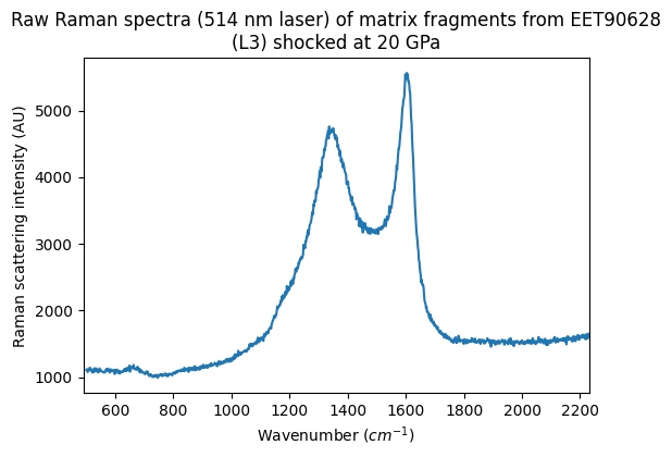 Raw Raman spectra (514 nm laser) of matrix fragments from EET90628 (L3) shocked at 20 GPa