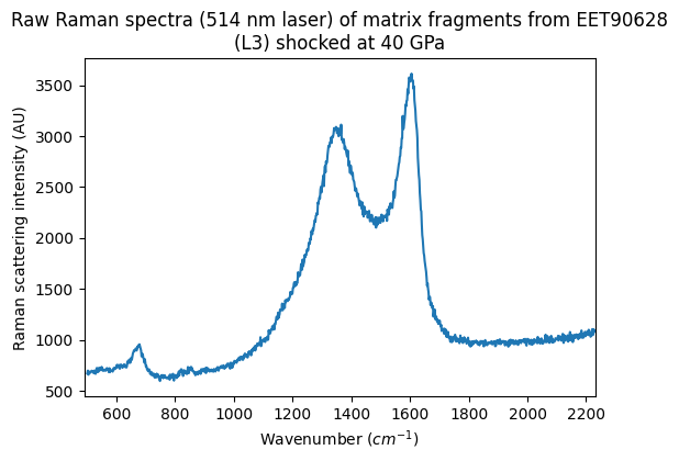 - Quirico, Eric; Bonal, Lydie (2010): Raman spectra (514 nm, raw and baseline-corrected) of matrix fragments and IOM extracted from unshocked and shocked Murchison (CM2 chondrite) and from shocked EET90628 (L3 chondrite). SSHADE/GhoSST (OSUG Data Center). Dataset/Spectral Data. https://doi.org/10.26302/SSHADE/EXPERIMENT_LB_20240904_001