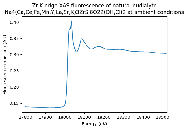 - Louvel, Marion; Malfait, Wim; Sanchez-Valle, Carmen (2009): Zr K edge XAS fluorescence of natural eudialyte Na4(Ca,Ce,Fe,Mn,Y,La,Sr,K)3ZrSi8O22(OH,Cl)2 at ambient conditions. SSHADE/FAME (OSUG Data Center). Dataset/Spectral Data. https://doi.org/10.26302/SSHADE/EXPERIMENT_ML_20171219_002