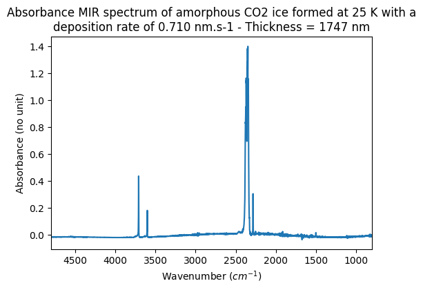 Absorbance MIR spectrum of amorphous CO2 ice formed at 25 K with a deposition rate of 0.710 nm.s-1 - Thickness = 1747 nm