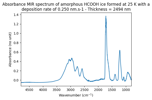 - Fray, Nicolas; Bouilloud, Michaëlle (2012): MIR absorbance spectra of amorphous HCOOH ice at 25K for different deposition rates and different thicknesses. SSHADE/SCOOP (OSUG Data Center). Dataset/Spectral Data. https://doi.org/10.26302/SSHADE/EXPERIMENT_NF_20250624_001