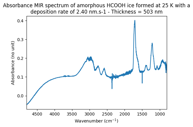 - Fray, Nicolas; Bouilloud, Michaëlle (2012): MIR absorbance spectra of amorphous HCOOH ice at 25K for different deposition rates and different thicknesses. SSHADE/SCOOP (OSUG Data Center). Dataset/Spectral Data. https://doi.org/10.26302/SSHADE/EXPERIMENT_NF_20250624_001