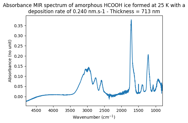 Absorbance MIR spectrum of amorphous HCOOH ice formed at 25 K with a deposition rate of 0.240 nm.s-1 - Thickness = 713 nm