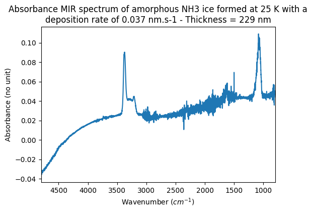 Absorbance MIR spectrum of amorphous NH3 ice formed at 25 K with a deposition rate of 0.037 nm.s-1 - Thickness = 229 nm