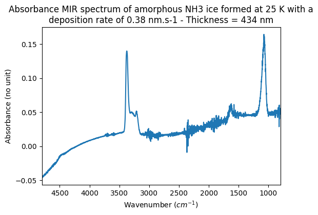 Absorbance MIR spectrum of amorphous NH3 ice formed at 25 K with a deposition rate of 0.38 nm.s-1 - Thickness = 434 nm