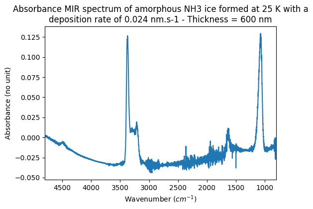 Absorbance MIR spectrum of amorphous NH3 ice formed at 25 K with a deposition rate of 0.024 nm.s-1 - Thickness = 600 nm