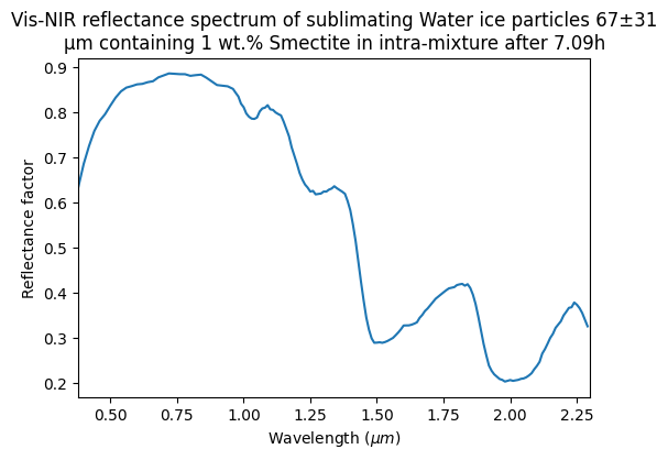 Vis-NIR reflectance spectrum of sublimating Water ice particles 67±31 μm containing 1 wt.% Smectite in intra-mixture after 7.09h