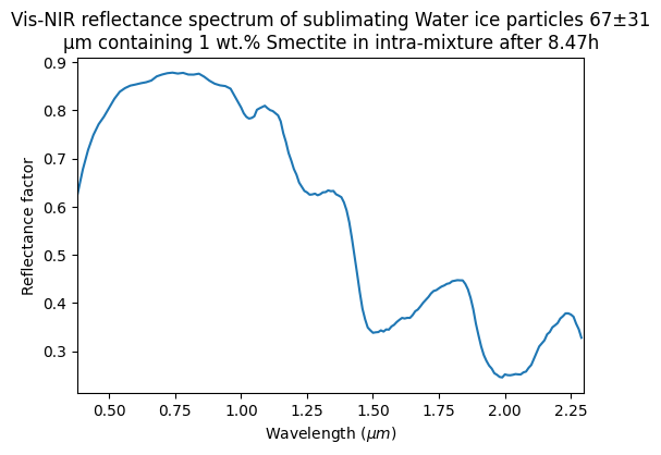 Vis-NIR reflectance spectrum of sublimating Water ice particles 67±31 μm containing 1 wt.% Smectite in intra-mixture after 8.47h