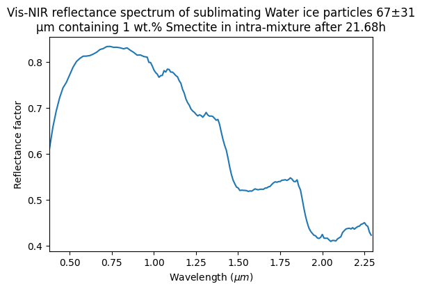 Vis-NIR reflectance spectrum of sublimating Water ice particles 67±31 μm containing 1 wt.% Smectite in intra-mixture after 21.68h