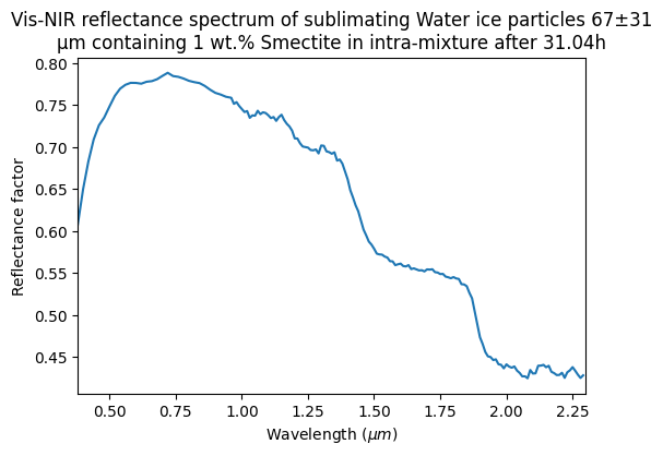 Vis-NIR reflectance spectrum of sublimating Water ice particles 67±31 μm containing 1 wt.% Smectite in intra-mixture after 31.04h