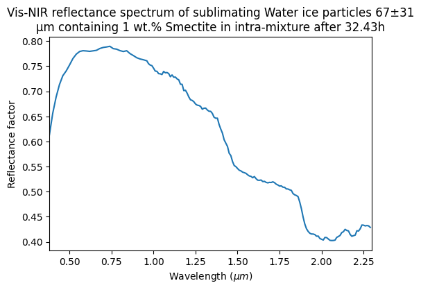 Vis-NIR reflectance spectrum of sublimating Water ice particles 67±31 μm containing 1 wt.% Smectite in intra-mixture after 32.43h
