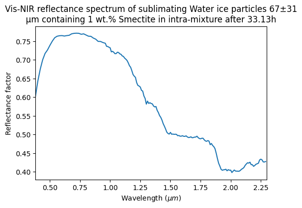 Vis-NIR reflectance spectrum of sublimating Water ice particles 67±31 μm containing 1 wt.% Smectite in intra-mixture after 15.54h