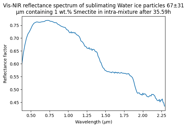 Vis-NIR reflectance spectrum of sublimating Water ice particles 67±31 μm containing 1 wt.% Smectite in intra-mixture after 4.35h