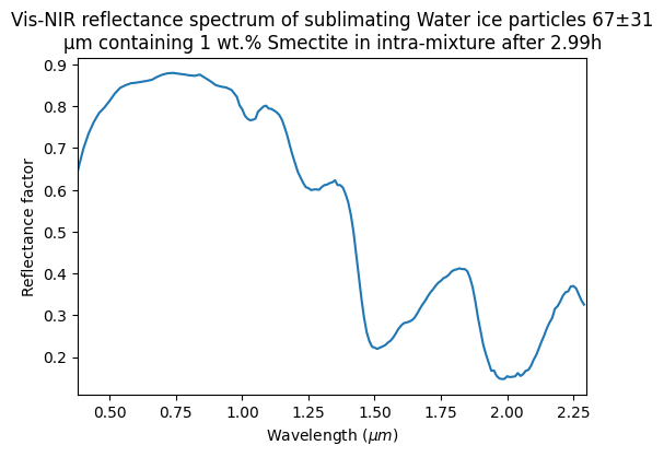 Vis-NIR reflectance spectrum of sublimating Water ice particles 67±31 μm containing 1 wt.% Smectite in intra-mixture after 2.99h