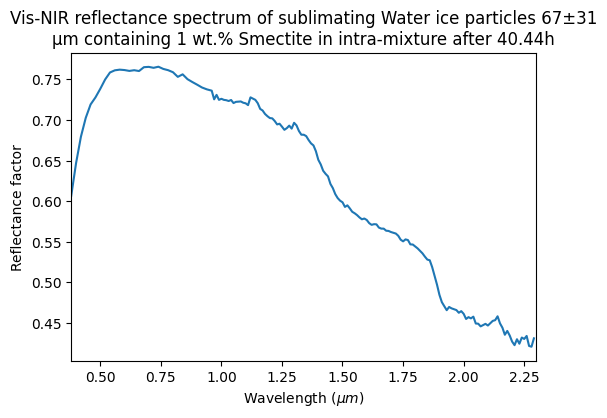 Vis-NIR reflectance spectrum of sublimating Water ice particles 67±31 μm containing 1 wt.% Smectite in intra-mixture after 40.44h