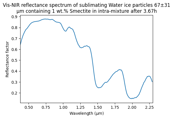 Vis-NIR reflectance spectrum of sublimating Water ice particles 67±31 μm containing 1 wt.% Smectite in intra-mixture after 3.67h