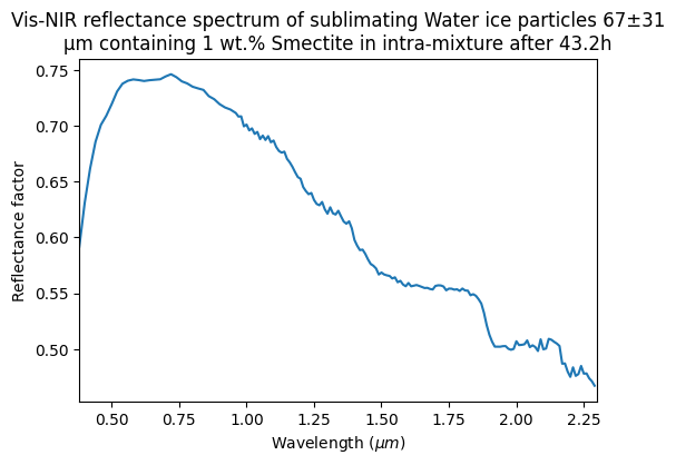 Vis-NIR reflectance spectrum of sublimating Water ice particles 67±31 μm containing 1 wt.% Smectite in intra-mixture after 9.17h