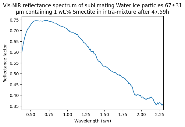 Vis-NIR reflectance spectrum of sublimating Water ice particles 67±31 μm containing 1 wt.% Smectite in intra-mixture after 8.47h