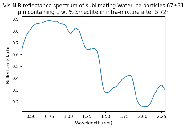 Vis-NIR reflectance spectrum of sublimating Water ice particles 67±31 μm containing 1 wt.% Smectite in intra-mixture after 5.72h
