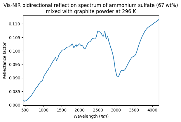 - Poch, Olivier (2018): Vis-NIR bidirectional reflection spectra of several ammonium salts mixed with graphite powder at 296 K. SSHADE/GhoSST (OSUG Data Center). Dataset/Spectral Data. https://doi.org/10.26302/SSHADE/EXPERIMENT_OP_20200212_001