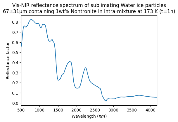 Vis-NIR reflectance spectrum of sublimating Water ice particles 67±31μm containing 1wt% Nontronite in intra-mixture at 173 K (t=1h)