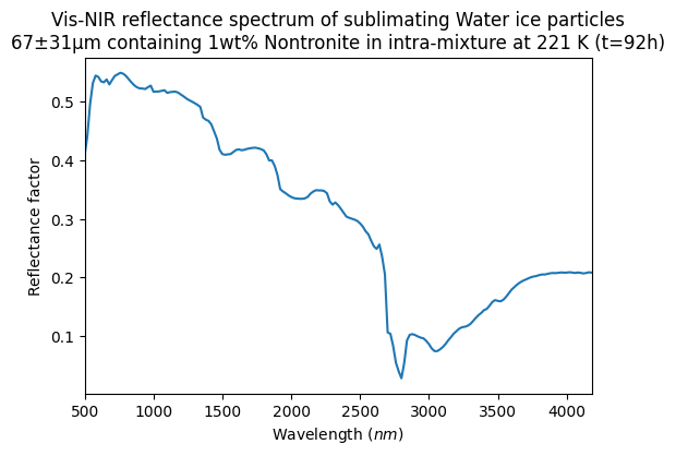- Schroeder, Stefan; Poch, Olivier; Ferrari, Marco; DeAngelis, Simone (2019): Vis-NIR reflectance spectra of Nontronite NAu-1, pure, mixed with Water ice, during and after ice sublimation. SSHADE/CSS (OSUG Data Center). Dataset/Spectral Data. https://doi.org/10.26302/SSHADE/EXPERIMENT_OP_20200701_001