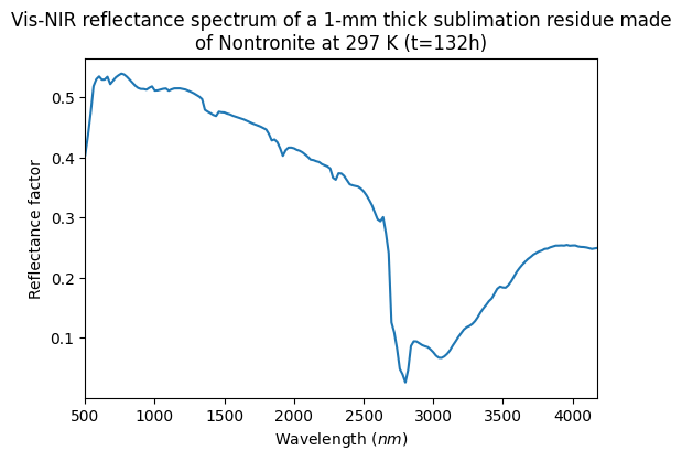 - Schroeder, Stefan; Poch, Olivier; Ferrari, Marco; DeAngelis, Simone (2019): Vis-NIR reflectance spectra of Nontronite NAu-1, pure, mixed with Water ice, during and after ice sublimation. SSHADE/CSS (OSUG Data Center). Dataset/Spectral Data. https://doi.org/10.26302/SSHADE/EXPERIMENT_OP_20200701_001