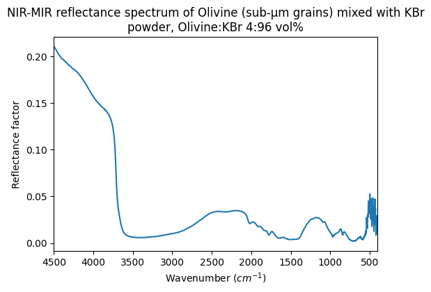 - Olivine (sub-micrometre sized grains) mixed with KBr powder, Olivine:KBr 4:96 vol%