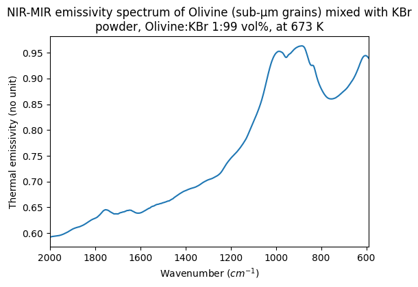 - Olivine (sub-micrometre sized grains) mixed with KBr powder, Olivine:KBr 1:99 vol%, at 673 K