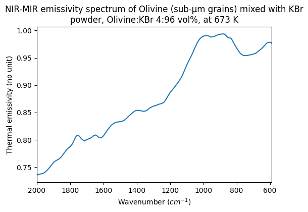 - Olivine (sub-micrometre sized grains) mixed with KBr powder, Olivine:KBr 4:96 vol%, at 673 K
