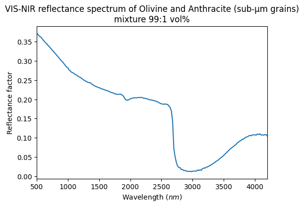 VIS-NIR reflectance spectrum of Olivine and Anthracite (sub-µm grains) mixture 99:1 vol%