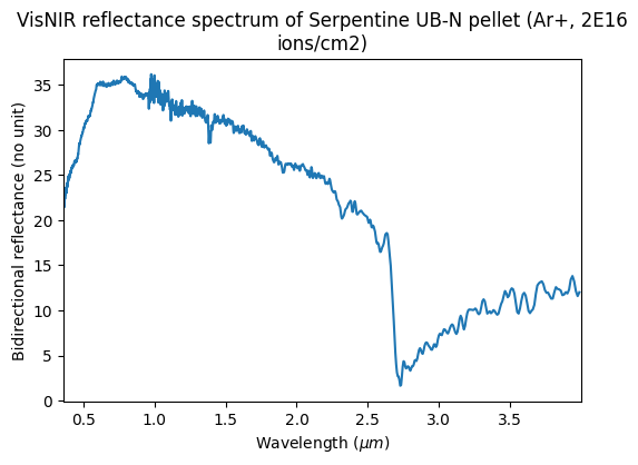 VisNIR reflectance spectrum of Serpentine UB-N pellet (Ar+, 2E16 ions/cm2)