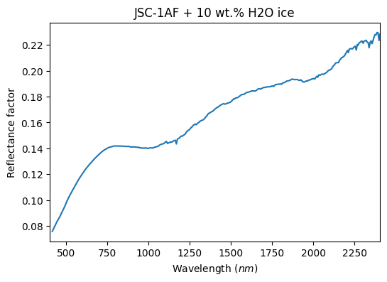 - Yoldi, Zuriñe (2018): VIS-NIR reflectance spectra of binary mixtures between the fine fraction of the JSC Lunar regolith simulant (JSC-1AF) and two types of spherical water ice particles. SSHADE/BYPASS (OSUG Data Center). Dataset/Spectral Data. https://doi.org/10.26302/SSHADE/EXPERIMENT_ZY_20180110_002