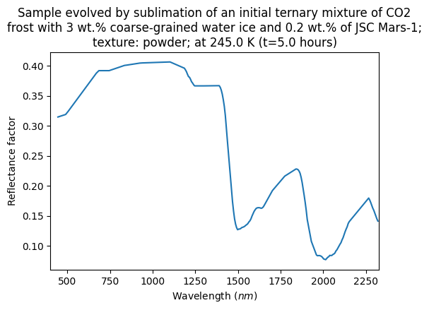 - Yoldi, Zuriñe (2018): VIS-NIR reflectance spectra collected during a sublimation experiment with ternary mixtures of CO2 frost, spherical water ice particles and JSC Mars-1 regolith simulant. SSHADE/BYPASS (OSUG Data Center). Dataset/Spectral Data. https://doi.org/10.26302/SSHADE/EXPERIMENT_ZY_20180207_000