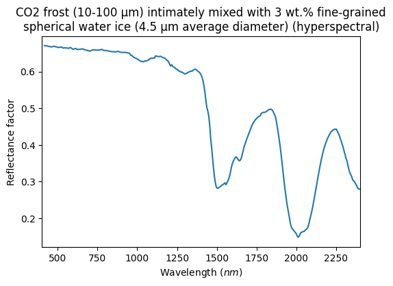 - Yoldi, Zuriñe (2018): VIS-NIR reflectance spectra of binary mixtures of CO2 frost (10-100 µm) and fine-grained spherical water ice particles (4.5 µm average diameter). SSHADE/BYPASS (OSUG Data Center). Dataset/Spectral Data. https://doi.org/10.26302/SSHADE/EXPERIMENT_ZY_20180209_000