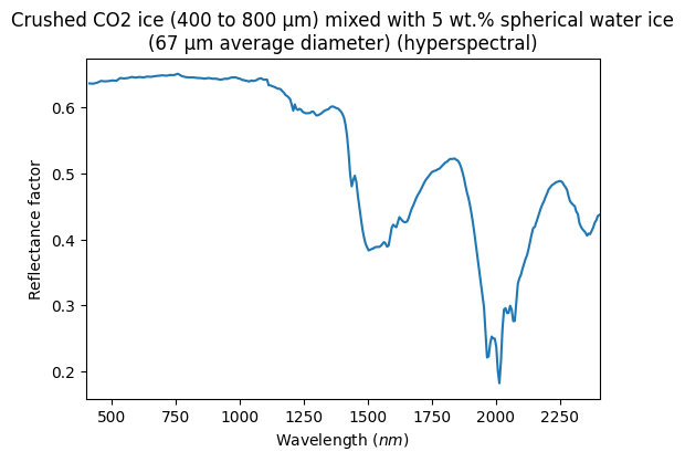 - Yoldi, Zuriñe (2018): VIS-NIR reflectance spectra of binary mixtures of coarse-grained crushed CO2 ice particles (400-800 µm) and spherical water ice particles (67 µm average diameter). SSHADE/BYPASS (OSUG Data Center). Dataset/Spectral Data. https://doi.org/10.26302/SSHADE/EXPERIMENT_ZY_20180213_000