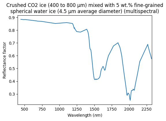 - Yoldi, Zuriñe (2018): VIS-NIR reflectance spectra of binary mixtures of coarse-grained crushed CO2 ice particles (400-800 µm) and spherical fine-grained water ice particles (4.5 µm average diameter). SSHADE/BYPASS (OSUG Data Center). Dataset/Spectral Data. https://doi.org/10.26302/SSHADE/EXPERIMENT_ZY_20180214_000
