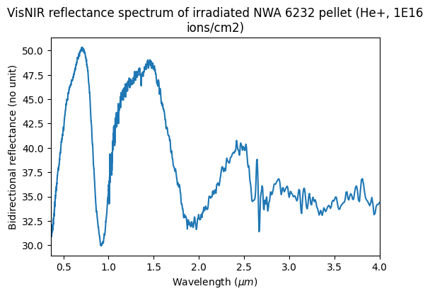VisNIR reflectance spectrum of irradiated NWA 6232 pellet (He+, 1E16 ions/cm2)